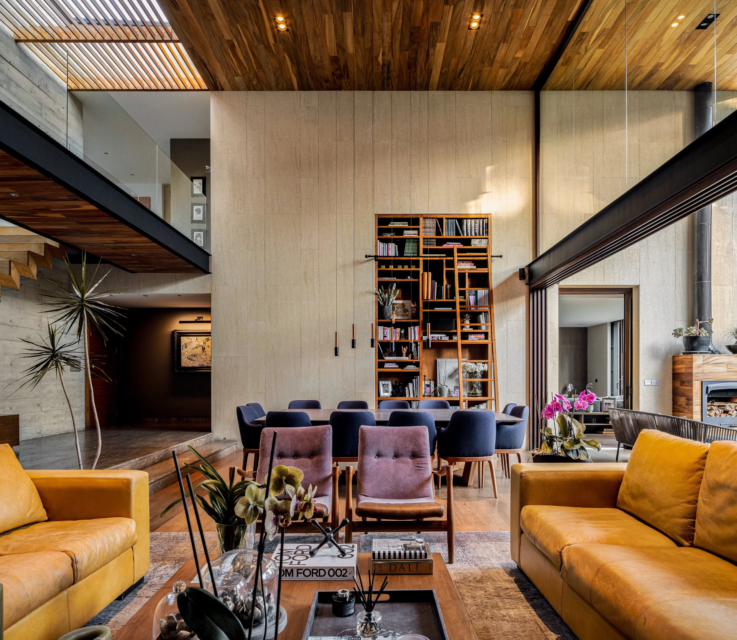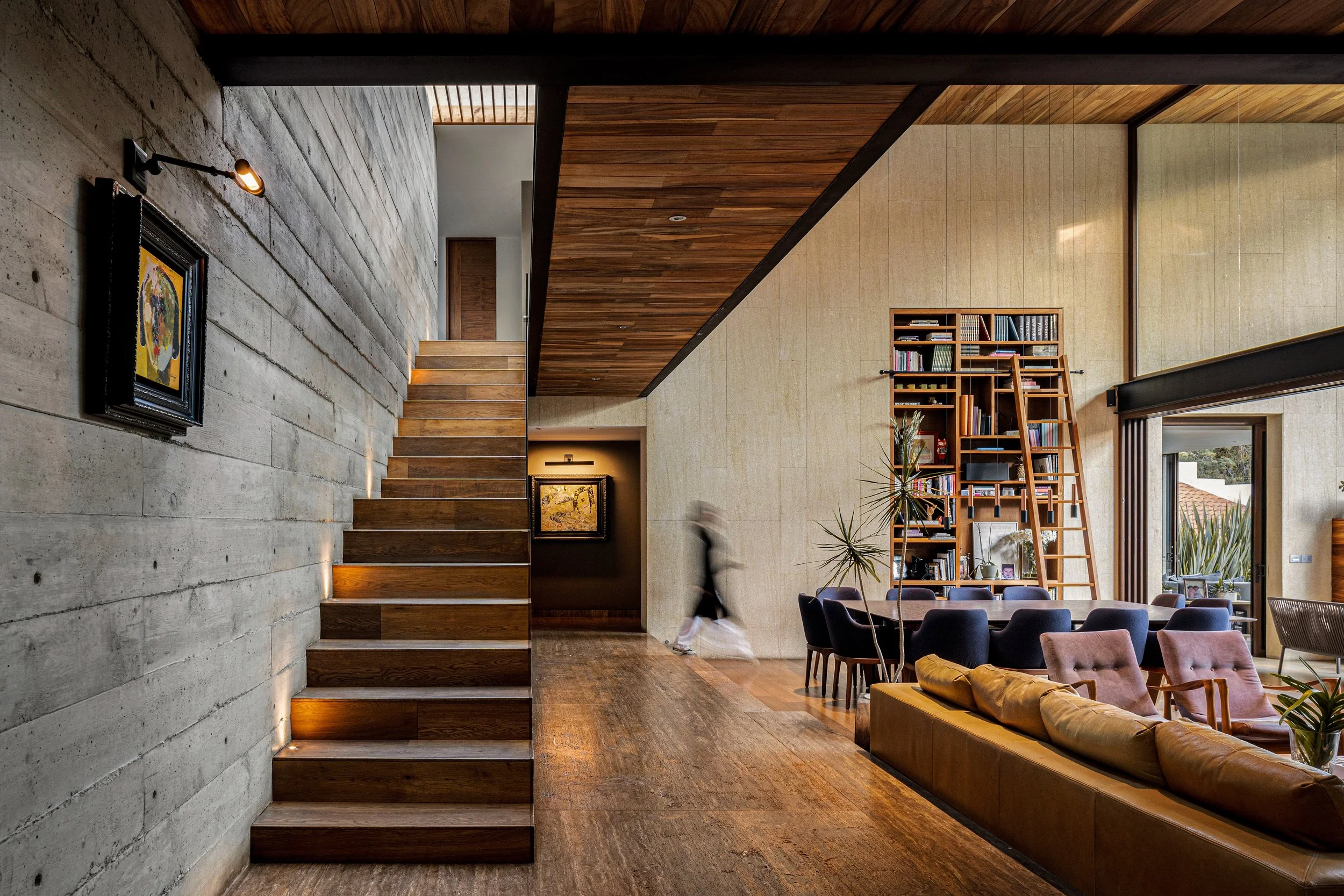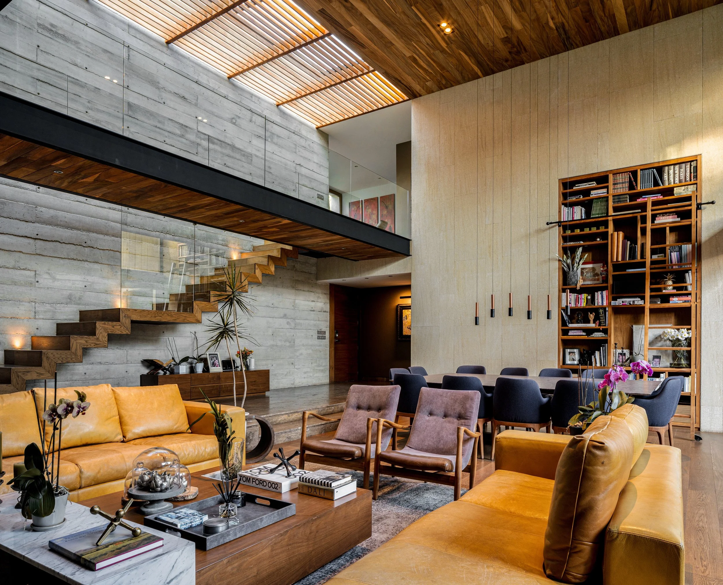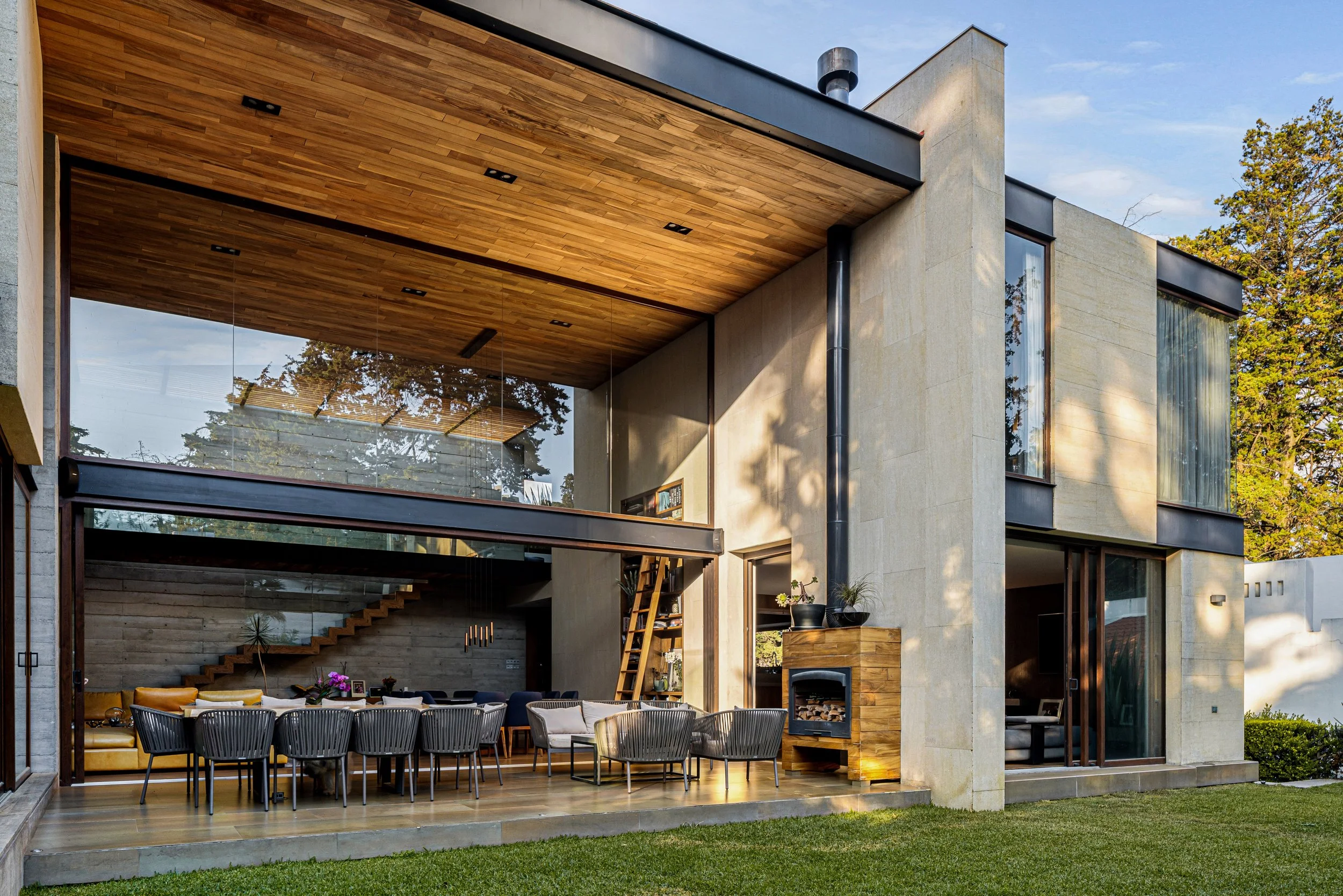 El diseño general de la casa busca generar una sensación de armonía y fluidez en todas las áreas, combinando un estilo moderno con un ambiente de contrastes cálidos y frios. El estilo arquitectónico de la casa se caracteriza por el uso de materiales en crudo que le dan un toque industrial y contemporáneo, como el concreto, metal y vidrio. Estos se combinan con una piedra natural cálida para crear una paleta cromática dinámica y contrastante. La doble altura y grandes aperturas en el interior crean una sensación de amplitud y conexión con el exterior. La iluminación natural se maximiza a través del uso de pérgolas y la piel vidrio que protege el núcleo de la casa.